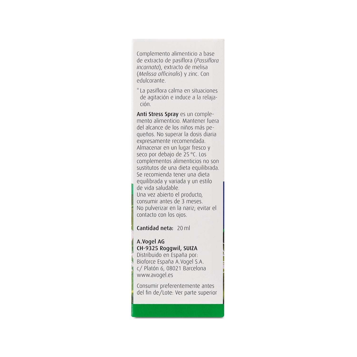 A. Vogel Anti Stress Spray 20ml er et kosttilskud med citronmelisseekstrakt, passionsblomst og zink , der fremmer øjeblikkelig afslapning af kroppen. Det hjælper med at holde kroppen vågen og frisk. Anbefales til øjeblikke med manglende ro, ideel til at aktivere energierne. Ikke-habit danner.