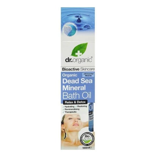 Dr Organic Badolie Dead Sea Minerals 100ml indeholder mineraler, havudtræk, sød mandelolie, macadamiaolie, ferskenolie, timianolie, papayaseed og C-vitamin. Det har beroligende egenskaber og hjælper med at fugte og genoprette huden.