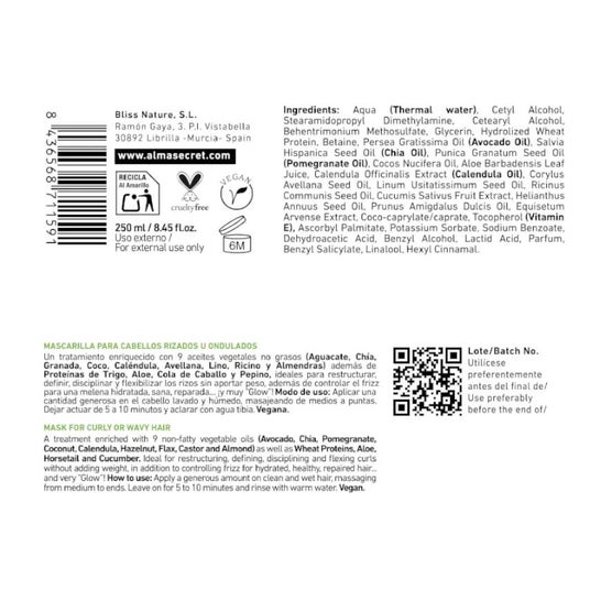 Maske til krøllet hår beriget med 9 ikke-fedtede planteolier for at opnå en meget intens næring af håret, der hjælper med at reparere og styrke hårstrået, samtidig med at definere og disciplinere krøllen for at opnå meget naturlige og elastiske bølger uden frizz-effekt. Desuden hjælper dens veganske og hypoallergeniske sammensætning med at beskytte håret mod varme, hvilket forbedrer dets tolerance over for termiske eller kemiske behandlinger og hjælper med at opnå en perfekt skinnende krøllet hårpragt.