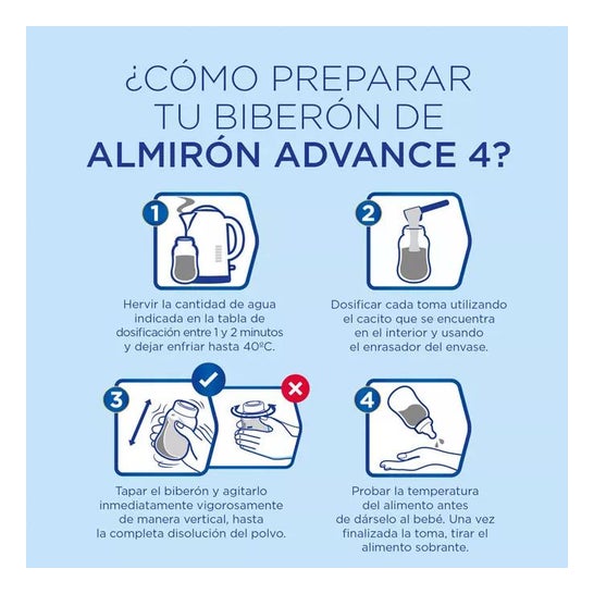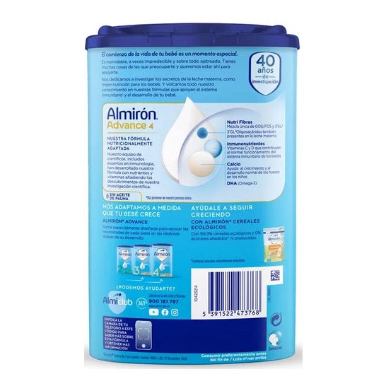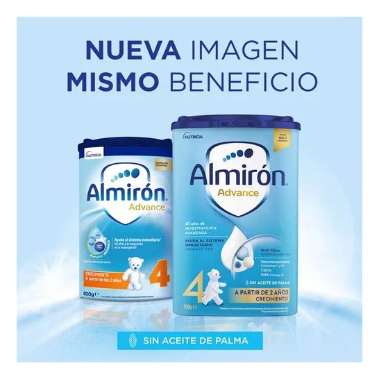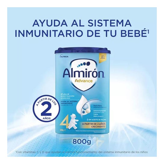 Almirón Advance 4 Leche de Crecimiento 800g er en pulveriseret eftermælk, der indeholder en kombination af Omega 6, Omega 3 og oligosaccharider, som findes i modermælk.