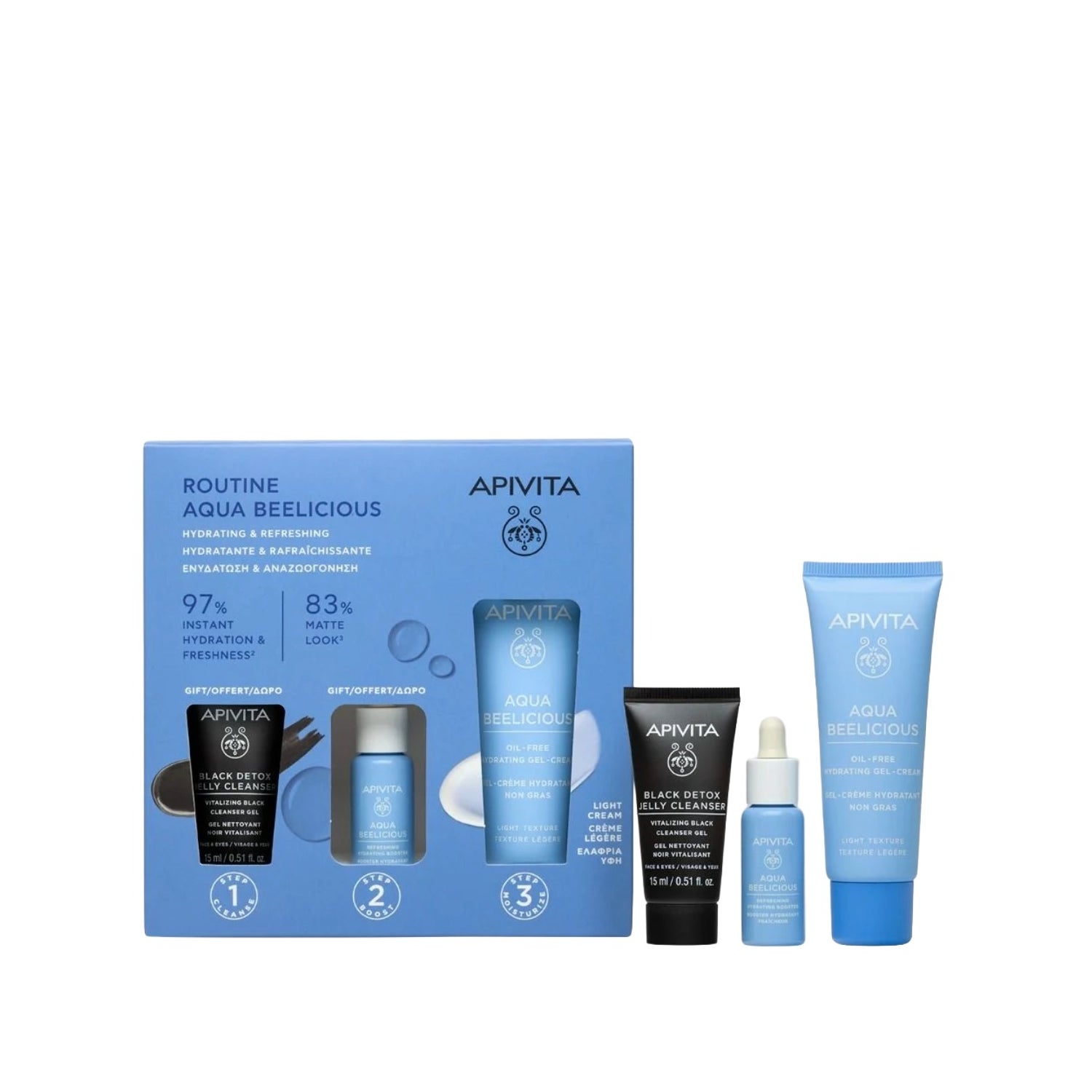 Apivita Rutine Aqua Beelicious Set Black Detox + Booster + Oil Free til dyb hydrering og ansigtsdetox er et sæt fra APIVITA, der er designet til en daglig rutine med friskhed og lysstyrke, med intens hydrering og uden tung følelse. Det inkluderer: