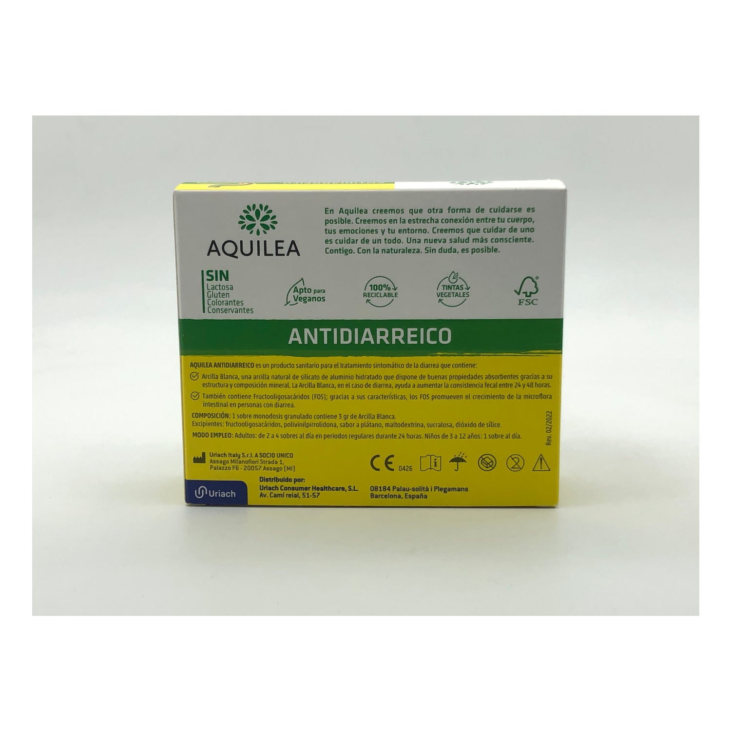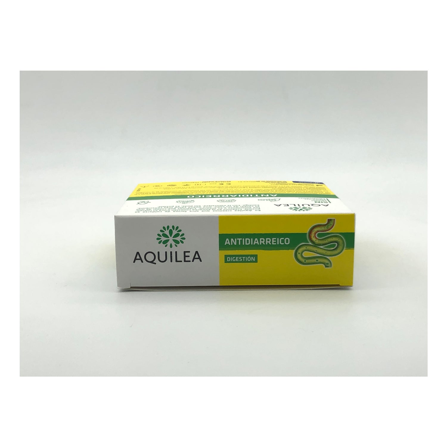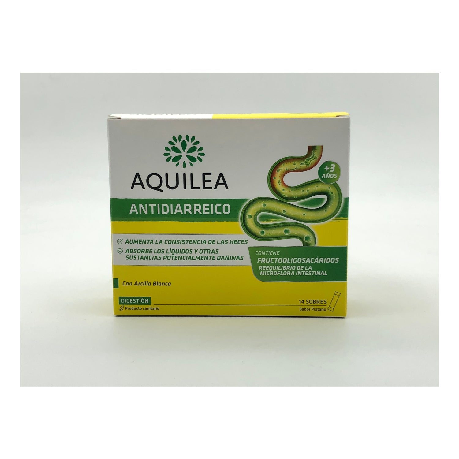 Aquilea Antidiarrhoeal 14abs er et kosttilskud mod diarré baseret på hvidt ler og fructooligosaccharider (FOS).