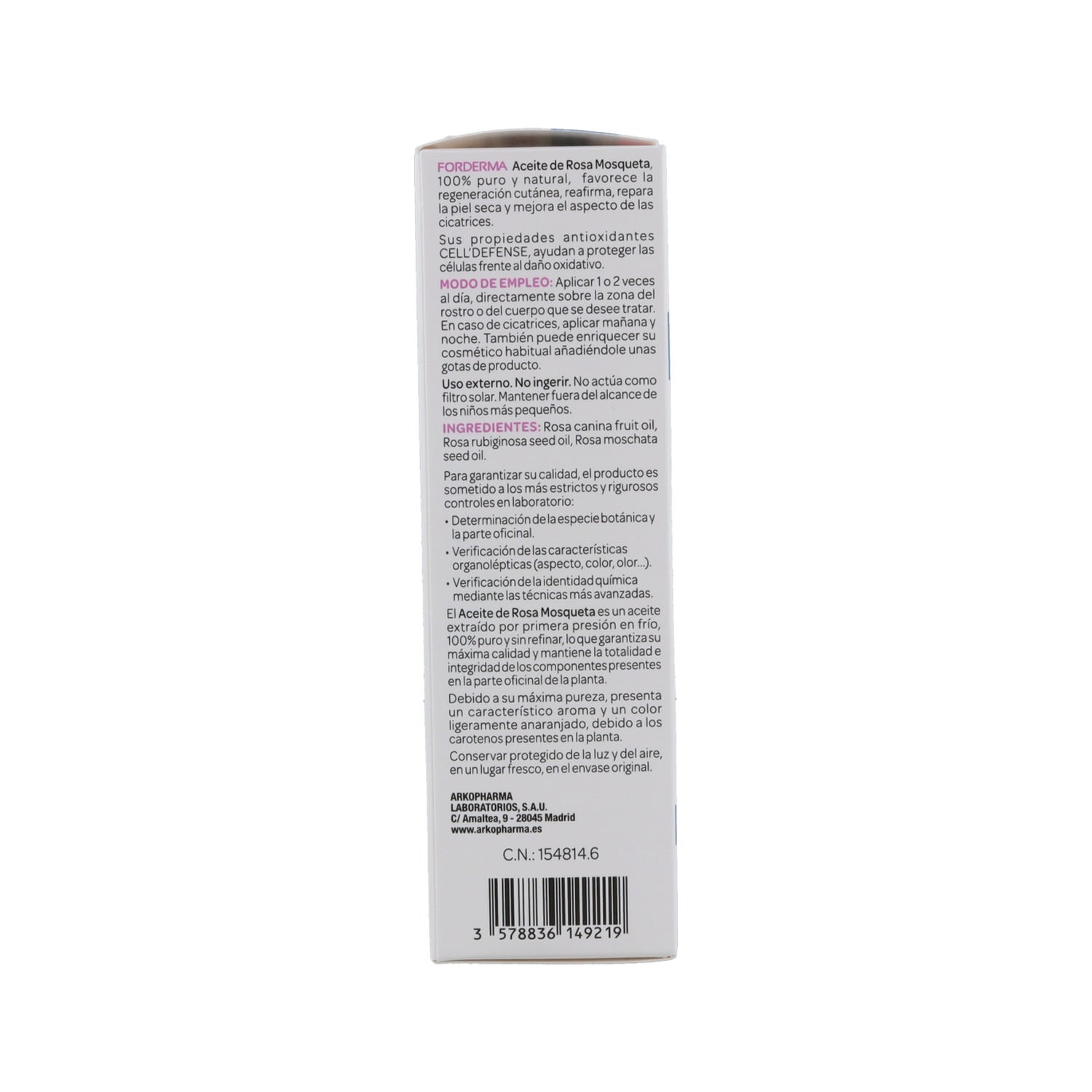 Arkopharma Arkoesencial Æterisk Olie Rosa Mosqueta 30ml er en olie , der bidrager til at mindske ar (forbrændinger, kirurgi, strækmærker, akne-ar...) og fine linjer, hvilket forbedrer hudens elasticitet.