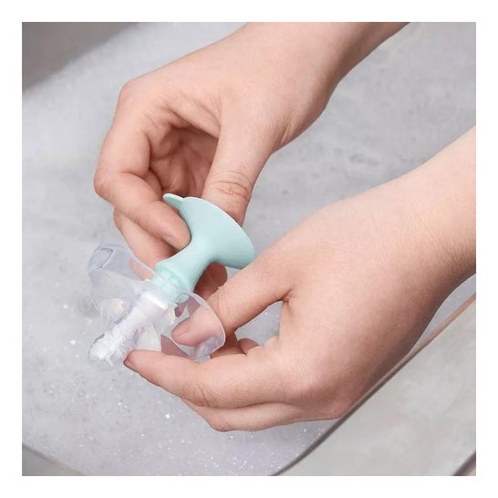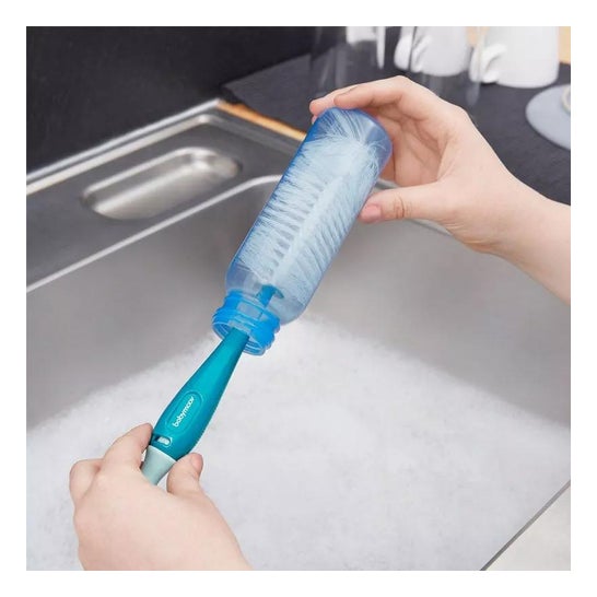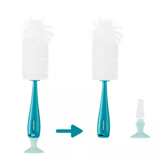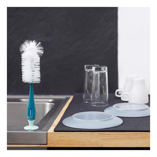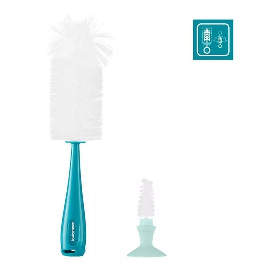 Universalbørste eller børste, der er egnet til rengøring af flasker og flaskesutter. Den er blød og fleksibel. Nå alle hjørner uden at ridse. Garanterer fuldstændig hygiejne. Meget praktisk. Der er en krog på den store børste og en sugekop på den lille børste for at hænge den op og lette tørringen. Egnet til alle mærker.