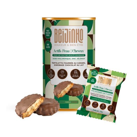 Beijinho Tartelette Chokolade med Mælk og Karamel Piel & Cabello 208g er tærter fyldt med karamel og dækket med mælkechokolade, beriget med hyaluronsyre, zink og selen, som fremmer hydrering, styrker hudbarrieren og støtter hårsundheden.