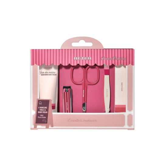 Beter Manicure Set Plaisirs Collection 5 stk er et kit til pleje af hænder og negle derhjemme, designet til daglig brug og til at tage med på rejse. Det inkluderer grundlæggende værktøjer til en komplet manicure og en nærende håndcreme.