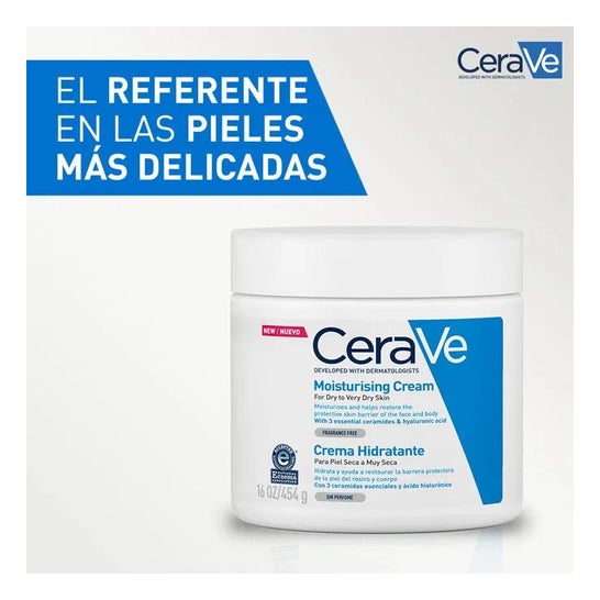 CeraVe Moisturising Cream for Dry to Very Dry Skin 454g er en lotion til krop og ansigt, som giver langvarig fugt, bl.a. ceramider og hyaluronsyre, som trænger ind i hudbarrieren og giver fugt i dybden. Den er ikke-komedogen og parfumefri, så den er velegnet til følsom hud eller hud med tendens til psoriasis, og dens lette konsistens betyder, at den hurtigt absorberes.