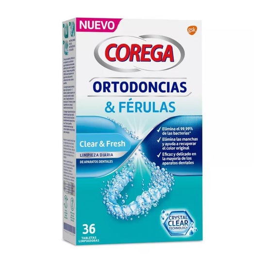 Corega Orthodontics & Splints Clear & Fresh 36 stk. er rengøringstabletter til rengøring af tandlægeapparater, som hjælper med at vedligeholde deres anvendelighed og udseende nemt.