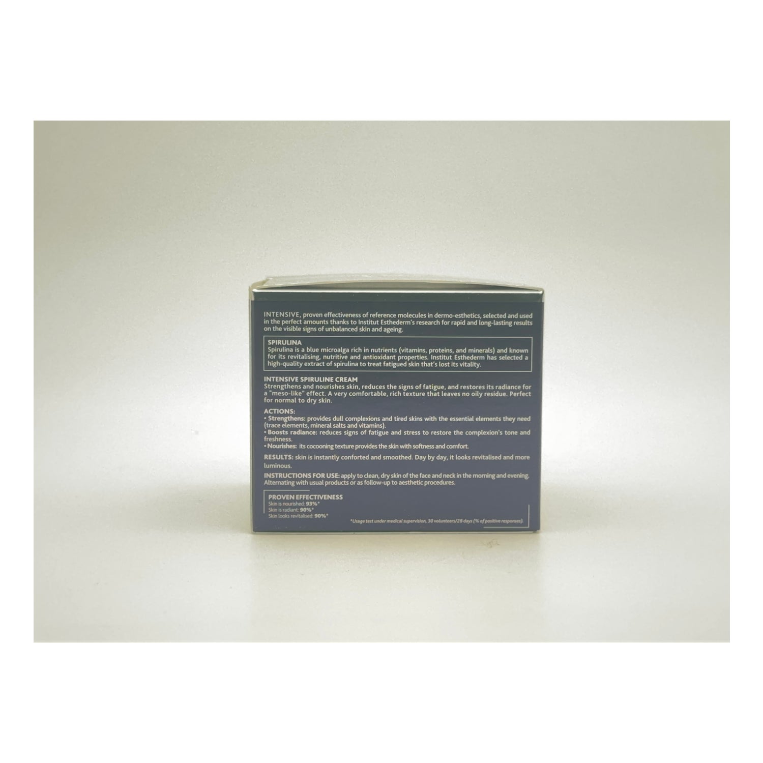 Institut Esthederm Spiruline Cream 50ml er en anti-ageing creme, der understøtter revitaliseringen af ansigtshuden og reducerer udseendet af træt, stresset og kedelig hud. Den er fremstillet af spirulina, som er en mikroskopisk blåalge, og har en revitaliserende, nærende og regenererende virkning på huden. Ud over sporstoffer, mineralsalte og vitaminer, essentielle fedtsyrer og antioxidanter, der hjælper med at behandle hudens fasthed og dæmpe linjer og mærker efter træthed og stress. Indikeret til behandling af kedelig og stresset hud.