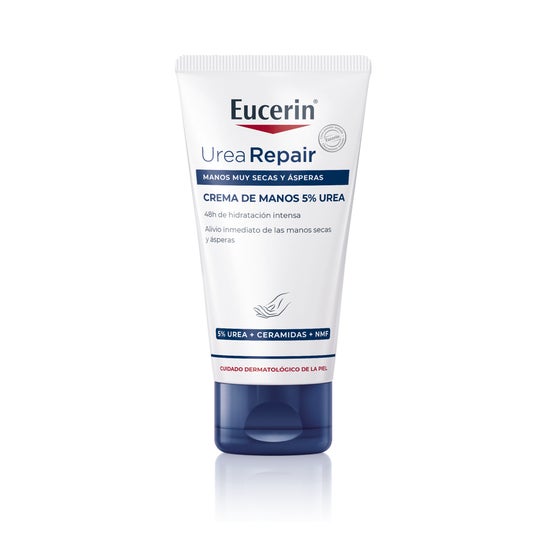 Eucerin UreaRepair Håndcreme 5% Urea 75ml er en løsning til tørre eller meget tørre hænder. Den hjælper med at nære hænderne i dybden takket være sit indhold af 5 % urea, ceramider og andre naturlige fugtighedsaktiver, som udøver en dybdegående fugtgivende effekt på huden.