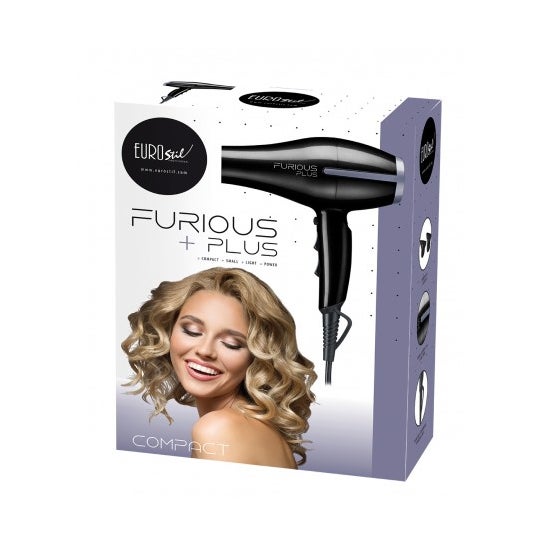 Eurostil Furious Plus hårtørrer har en effekt på 2200W og ionisk, keramisk og turmalinteknologi, der giver en hurtigere tørring og en glattere og mere glansfuld finish på håret. Reducerer hårets aldring og har en bakteriedræbende effekt. Tekniske specifikationer: - Effekt 2200W. - Vægt 590g. - 2 hastigheder. - 3 temperaturer. - Koldluftsknap. - 2 dyser. - Aftageligt filter. - Sikkerhedstermostat. - Spænding 220-240V. - Frekvens 50Hz. - 22,6 cm bred.