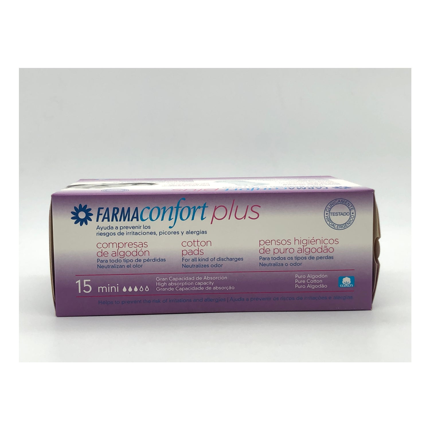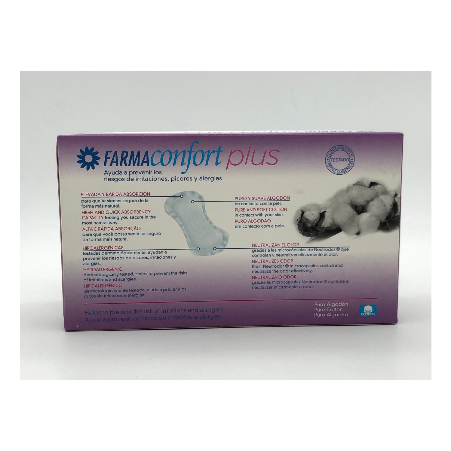 Farmaconfort har udviklet en feminin hygiejne linje lavet med 100% naturlige bomuldsfibre, et helt hygiejnisk produkt, der hjælper med at reducere irritationen eller kløen på dette følsomme hudområde af en kvindes krop.