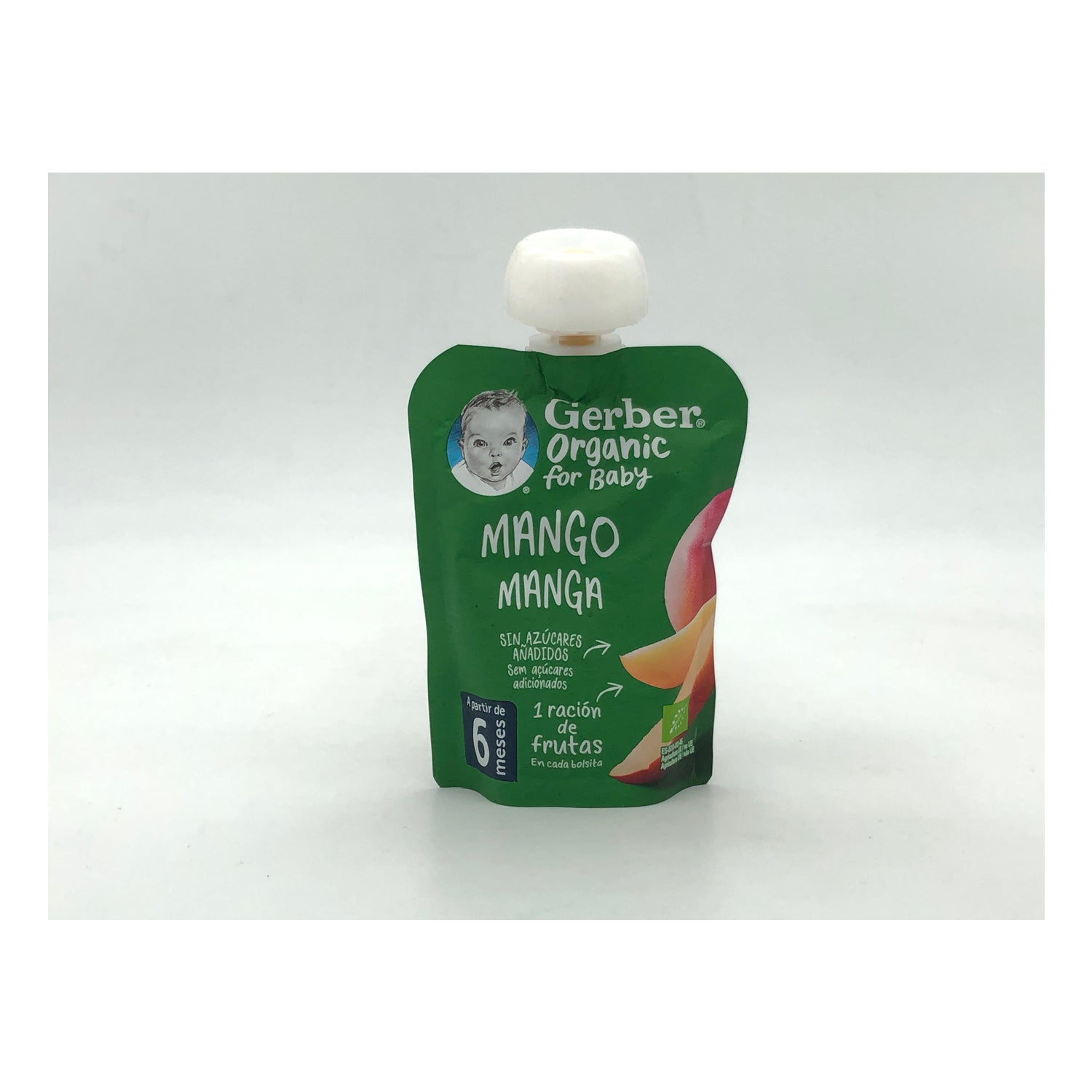 Gerber Organic Puree Mango 90g er en frugtpuré til babyer i flødemadsalderen i en praktisk pose med tætsluttende låg.