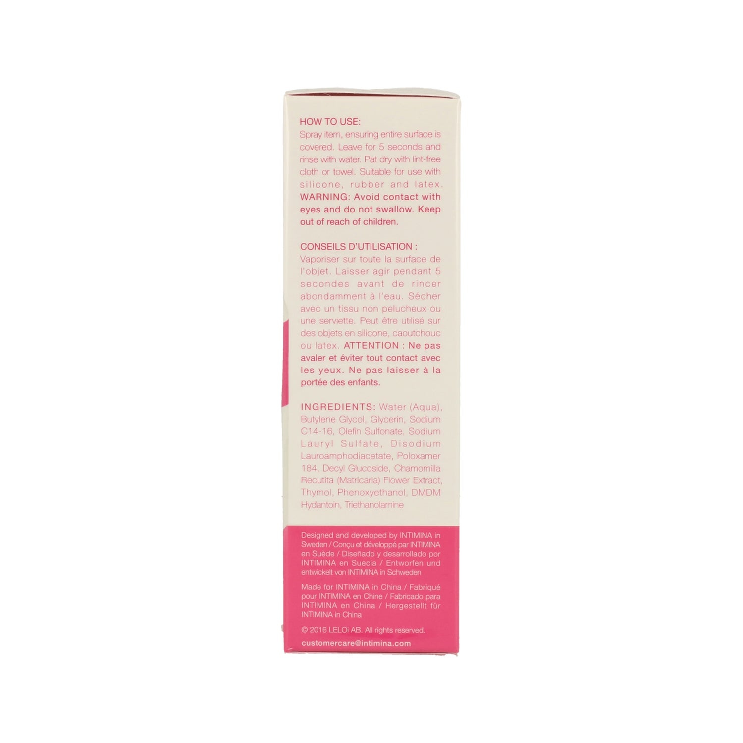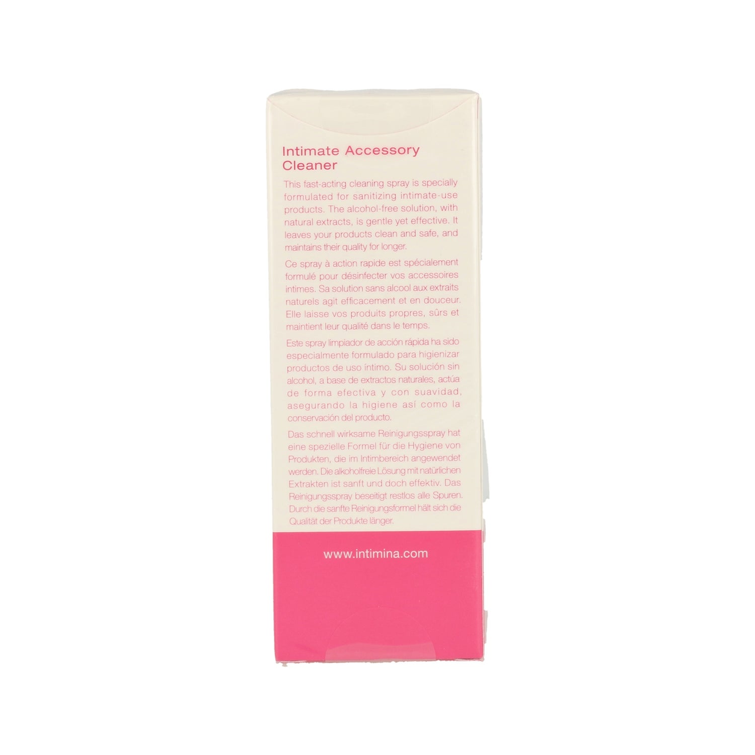 Intimina Intim Accessory Cleaner er en praktisk spray, der er meget nem at bruge til at rengøre intime produkter. Dens hurtigtvirkende alkoholfri sammensætning renser produktets overflade i sekunder, mens zinksaltene blødgør opløsningen for at forhindre enhver mulig irritation.