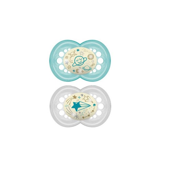 Mam Night Latex-sut Fisio +6 m Blå 2 stk. er en pakke med 2 mam Original Night latex-sutter til babyer over 6 måneder. Den anatomiske sut af naturlatex tilpasser sig perfekt til barnets mund, hvilket giver komfort, når barnet sutter, og fremmer udviklingen af musklerne i tungen og munden. Suttens skjold lyser op i mørket, så den er nem at finde når som helst.