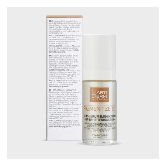Martiderm ® DSP Illuminating Serum er et depigmenterende serum, der er specielt forberedt til pleje af huden med større akkumulering af pletter og ufuldkommenheder , hvilket hjælper huden med at forhindre denne type mærker og genvinde sin oprindelige lysstyrke. Dens formel er beriget med genistein, fytinsyre og bellis perennis , alle disse essentielle elementer, når det kommer til at depigmentere huden på en rationel og selektiv måde og kun arbejder på de områder, der straks straffes af pletterne.