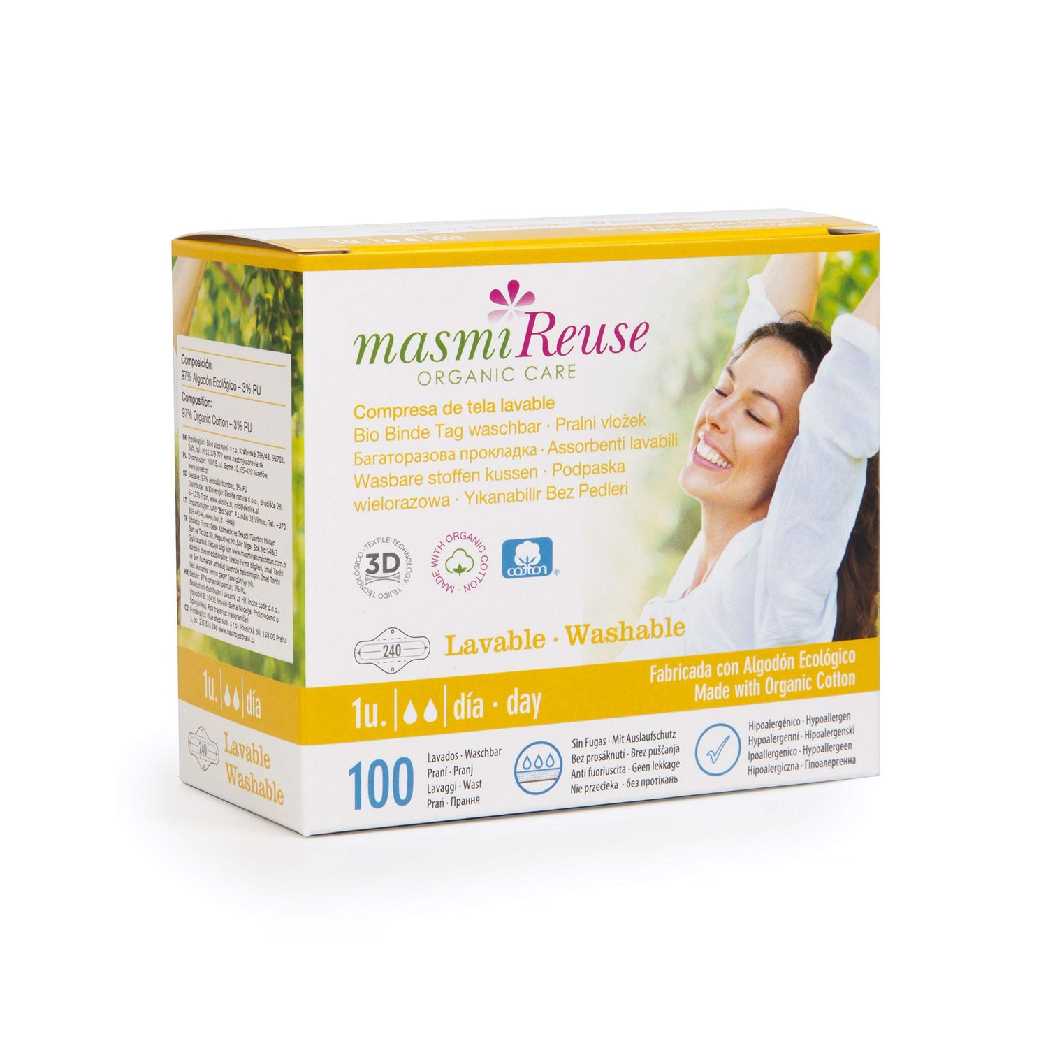 Vaskbar kompres af hypoallergenisk stof til kvinder i menstruation, kraftig blødning eller postpartum. Fremstillet af økologisk bomuld certificeret af Global Organic Textile Standard.