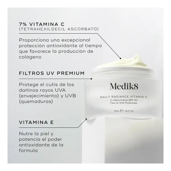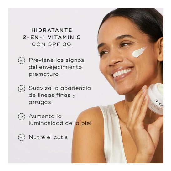 Antioxidant ansigtscreme designet til daglig pleje af alle hudtyper. Formuleret med solbeskyttelsesfiltre SPF30 og vitamin C, som bidrager til at skabe en anti-forureningsskjold over ansigtet og forhindre for tidlig aldring. Beriget med hyaluronsyre og glycerin, som hjælper med at opretholde fasthed og hydrering af epidermis. Desuden har den en let, cashmere-lignende tekstur og hurtig absorption. Velegnet til veganere. Dermatologisk testet.