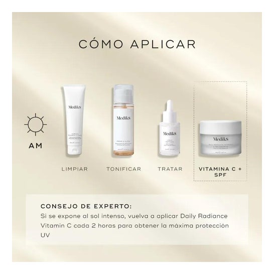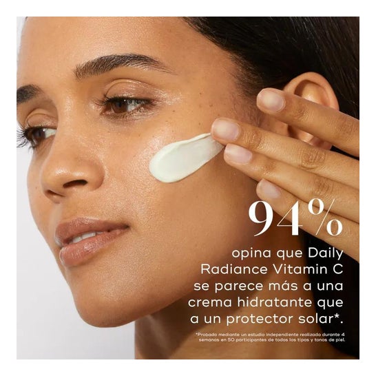 Efter den morgenlige rengøring, brug spatlen til at påføre en generøs mængde Daily Radiance Vitamin C og fordele den jævnt over ansigtet, halsen og décolleté.