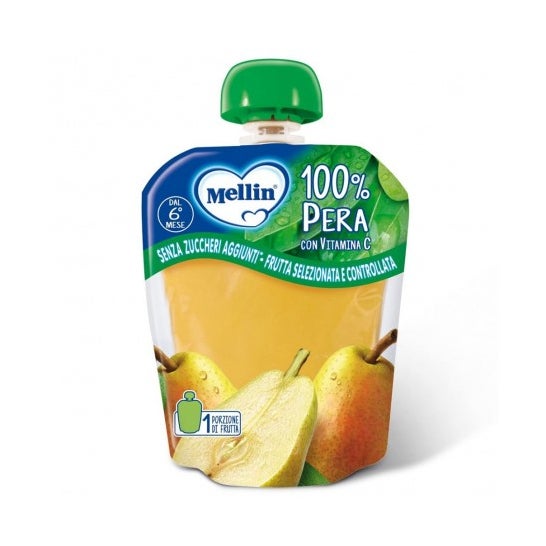 Mellin Pera er en mad designet til babyer fra 6 måneders alderen, anbefalet af børnelæger. Den består af pære puré uden tilsat sukker, lavet med frugt af høj kvalitet og beriget med vitamin C for en komplet ernæring.