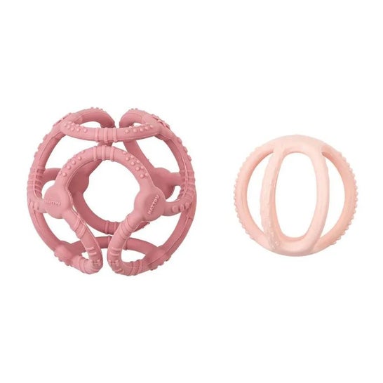 Nattou Sæt Bideringe Silikone Rosa 2stk er et sæt af to silikonebolde, der fungerer som en bidering og et legetøj. Disse bolde er ideelle til at følge med babyer og børn i løbet af tandfrembruddet af de første tænder. Deres ru overflade giver en blid massage til tandkødet, hvilket lindrer ubehaget forbundet med denne proces.