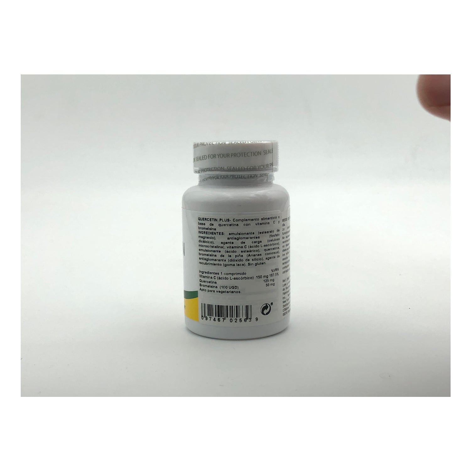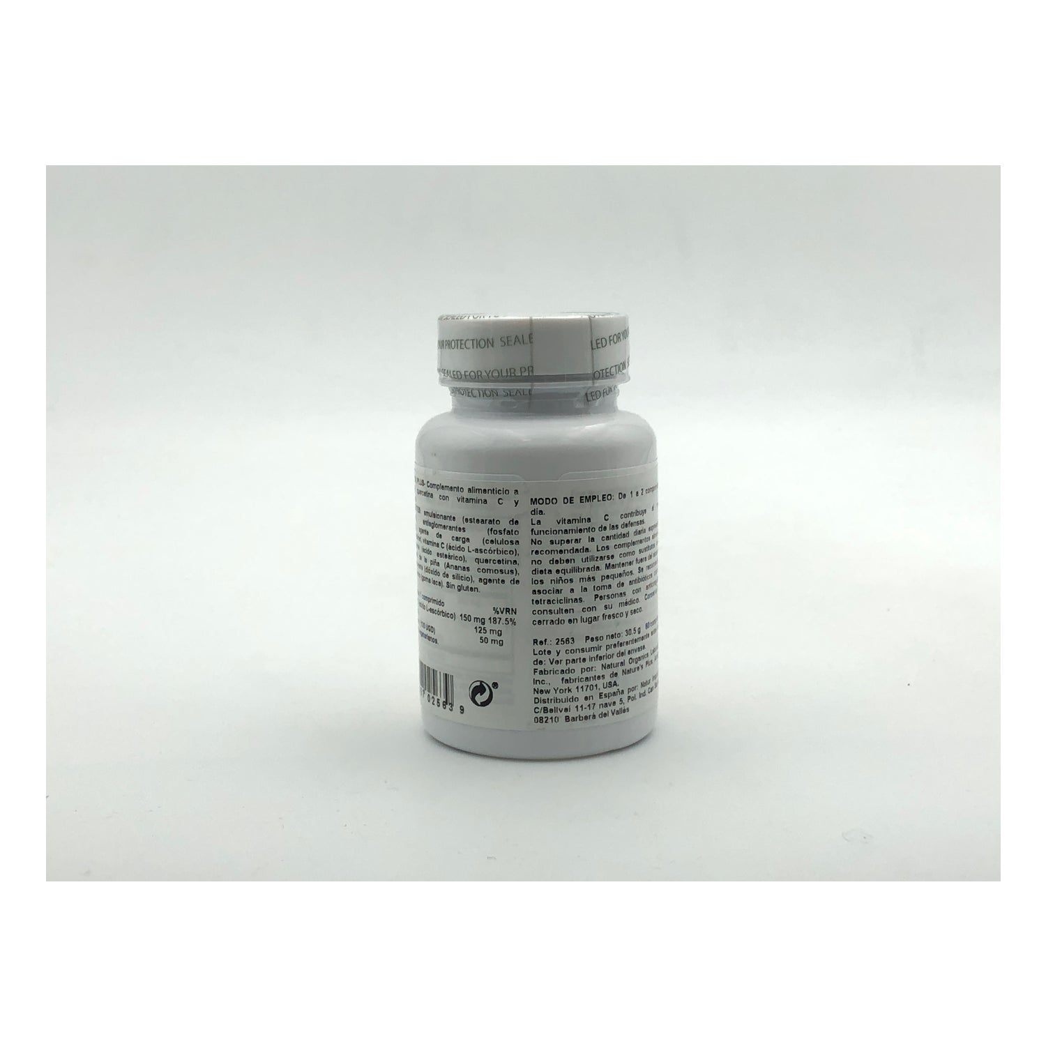 Bulking agents: microcrystalline cellulose. Vegetable cellulose, ascorbic acid (vitamin C), dicalcium phosphate, Quercetin. Firming agent: stearic acid. Magnesium stearate, bromelain. Gelling agent: hydroxypropyl methylcellulose. Anti-caking agent: silica. Coating agent: pharmaceutical varnish.IngredientsFor 2 tablets%IR*Vitamin C300 mg375% of the IRQuercetin250 mgBromelain (200 GDU)100 mg*IR: Reference Intake.