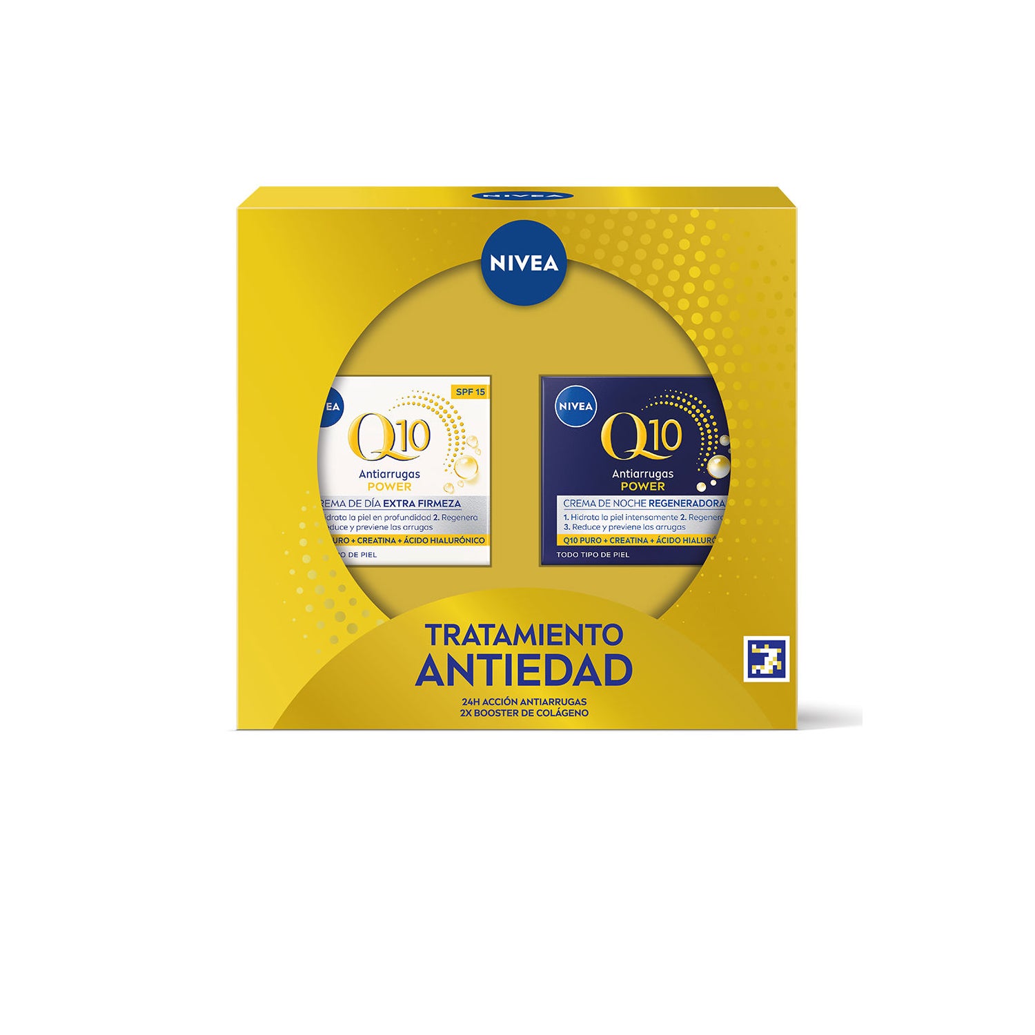 Nivea Q10 Power Pack Anti-Aging Treatment for firm skin and reduced wrinkles includes a day cream with SPF30 and a regenerating night cream. Its formulas are enriched with pure coenzyme Q10 identical to that of the skin and creatine, for a daily anti-aging routine.