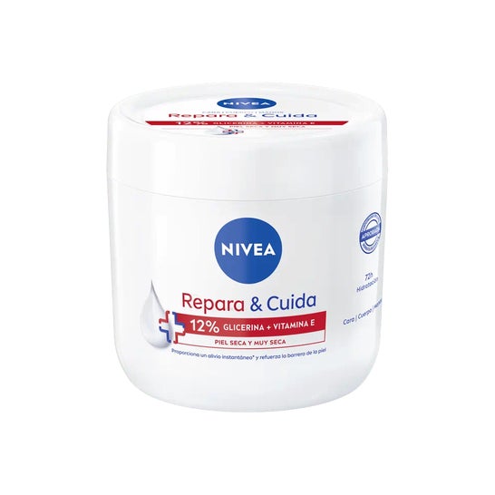 Nivea Reparer & Pleje 12% Glycerin + Vitamin E er en kropscreme designet til at give øjeblikkelig lindring til tør og meget tør hud. Dens innovative formel, der indeholder 12% glycerin og vitamin E, virker effektivt og opnår en hydrering, der varer op til 72 timer.