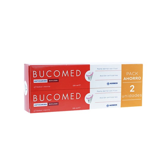 Normon Bucomed Pack Tandpasta Anticaries 2x125 ml inkluderer to rør af tandpasta anticaries på 125 ml hver, med frisk mintsmag. Den er beregnet til profylakse af tandkaries og til daglig mundhygiejne for voksne og børn fra 6 år.