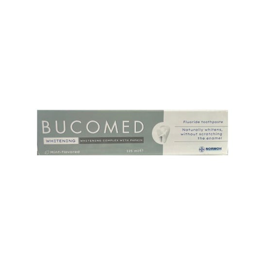 Normon Bucomed Blegemiddel Pasta 125 ml hjælper med at blege tænderne på en naturlig og sikker måde. Den bruger naturlige enzymer til at fjerne overfladiske pletter forårsaget af: