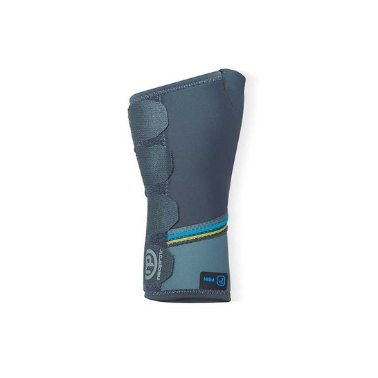 Prim Muñequera Neoprair Pulgar TM 1ud er en neoprenanordning designet til behandling og forebyggelse af skader i håndleddet og hånden. Den er fremstillet af åndbart neopren med en tykkelse på 3 mm og tredimensionel kompression, hvilket gør denne støtte ideel til at tackle tilstande som traumer i det første metacarpale, senebetændelse i håndleddet eller tommelfingeren, postoperativ pleje i disse områder, forstuvninger, slidgigt, arthritis og bursitis. Den skiller sig ud med sin aftagelige aluminiums tommelfingerplade, der hjælper med at aflaste de metacarpale led, samt den også aftagelige aluminiums håndfladeplade og plastskinnerne, der øger stabiliseringen. Med 4 faste lukninger for en perfekt tilpasning, inkorporerer dette produkt teknologien 'AirLock System', som fremmer hudens transpiration samtidig med at den bevarer den indre varme for at øge lindring og lette en hurtig genopretning. Anbefalet både til behandling og forebyggelse af skader i håndleddet eller hånden, er Prim Muñequera Neoprair Pulgar TM 1ud et optimalt valg for dig, der ønsker at passe på dit ledhelbred.