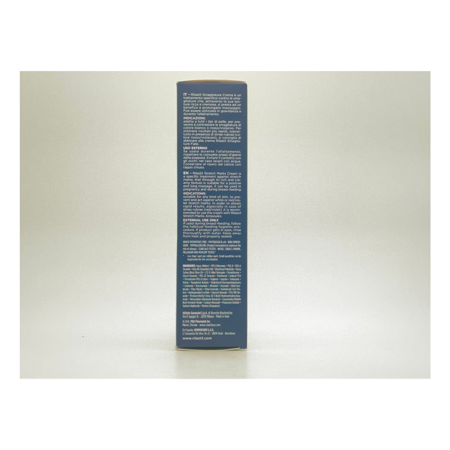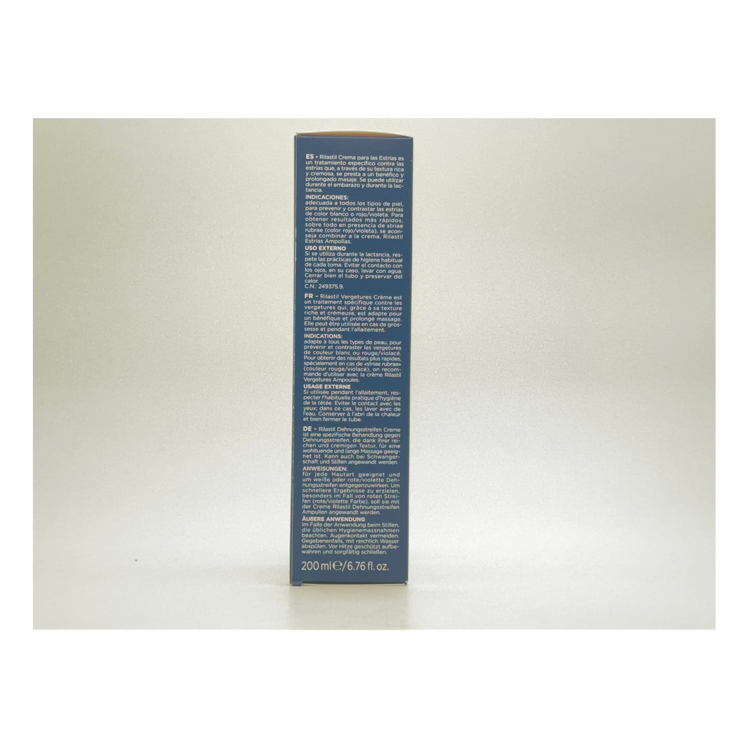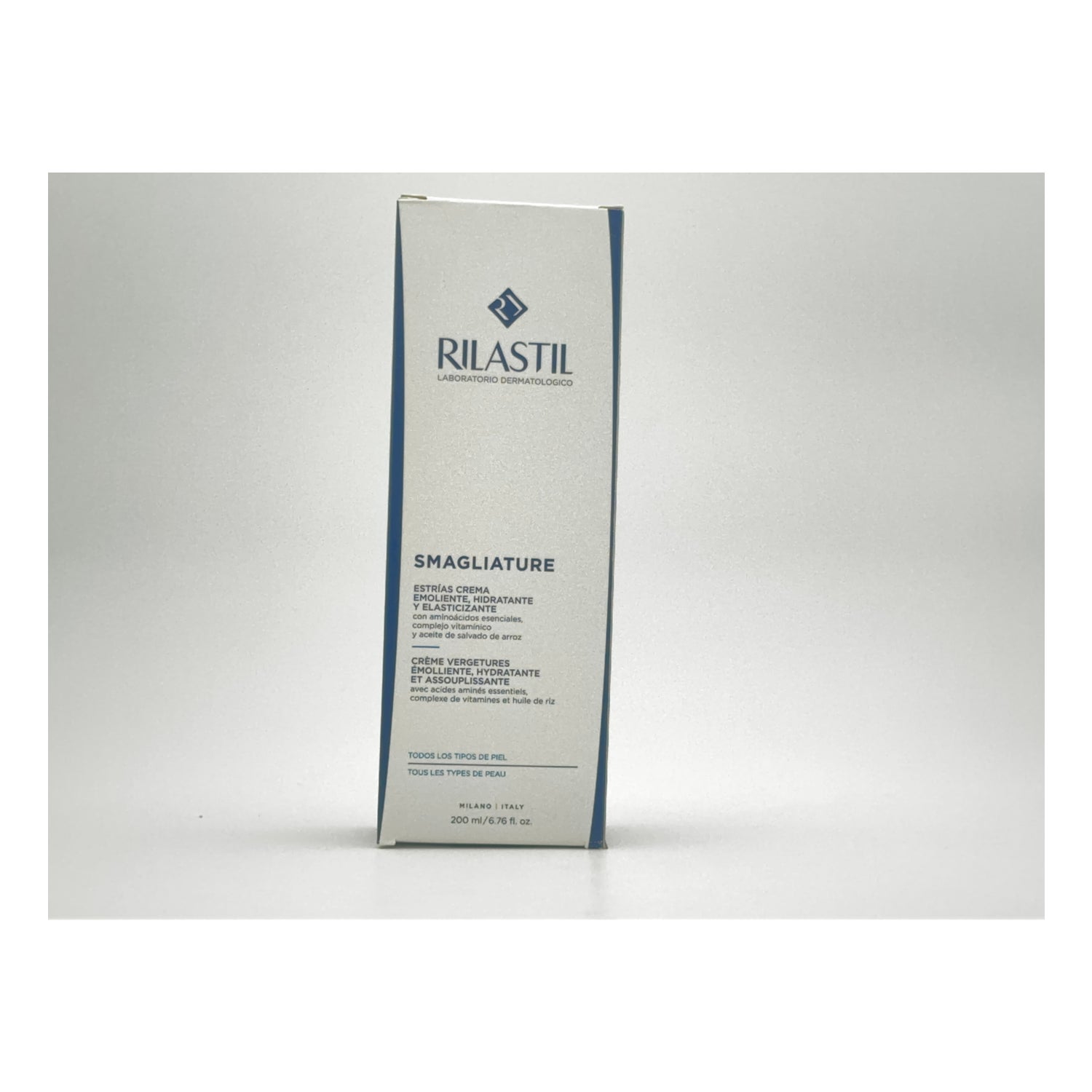 Rilastil Intensive anti-stretch mark creme er en behandling indikeret til forebyggelse af atrofiske stregmærker forårsaget af brud på kollagen og elastin fibre i forskellige faser: ungdomsår, graviditet, vægtvariationer ...