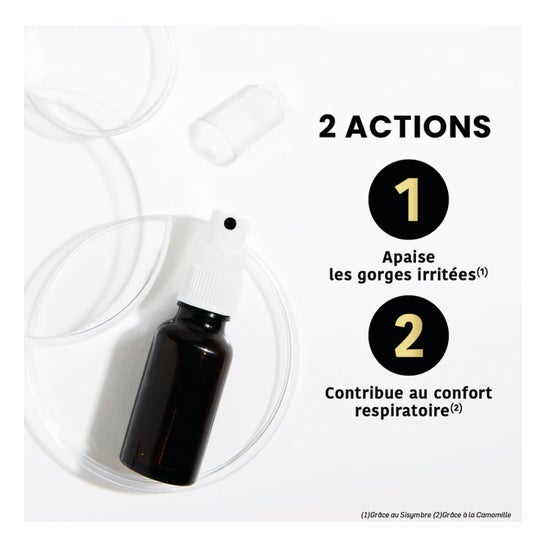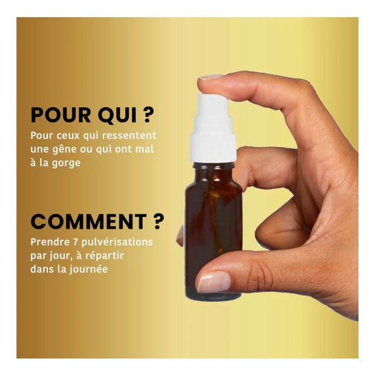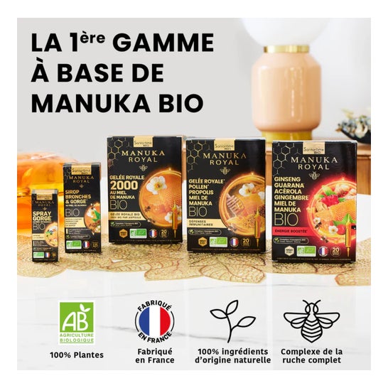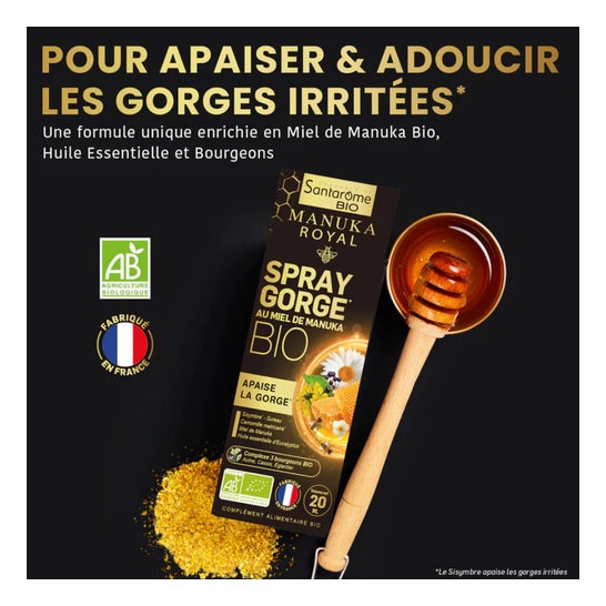 Santarome Spray Hals Manuka Royal Bio 20ml forener fordelene ved fytoterapi, bier, aromaterapi og gemoterapi for at berolige irriterede hals og fremme åndedrætskomfort.