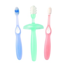 Læringssæt med 3 enheder af udviklingsdygtige tandbørster, specielt designet til brug hos babyer fra 6 måneder, for at hjælpe dem med at udvikle korrekte hygiejnevaner. Indeholder 3 børster fremstillet af blødt materiale og med håndtag, der kan tilpasses bedre til størrelsen på babyens hænder.