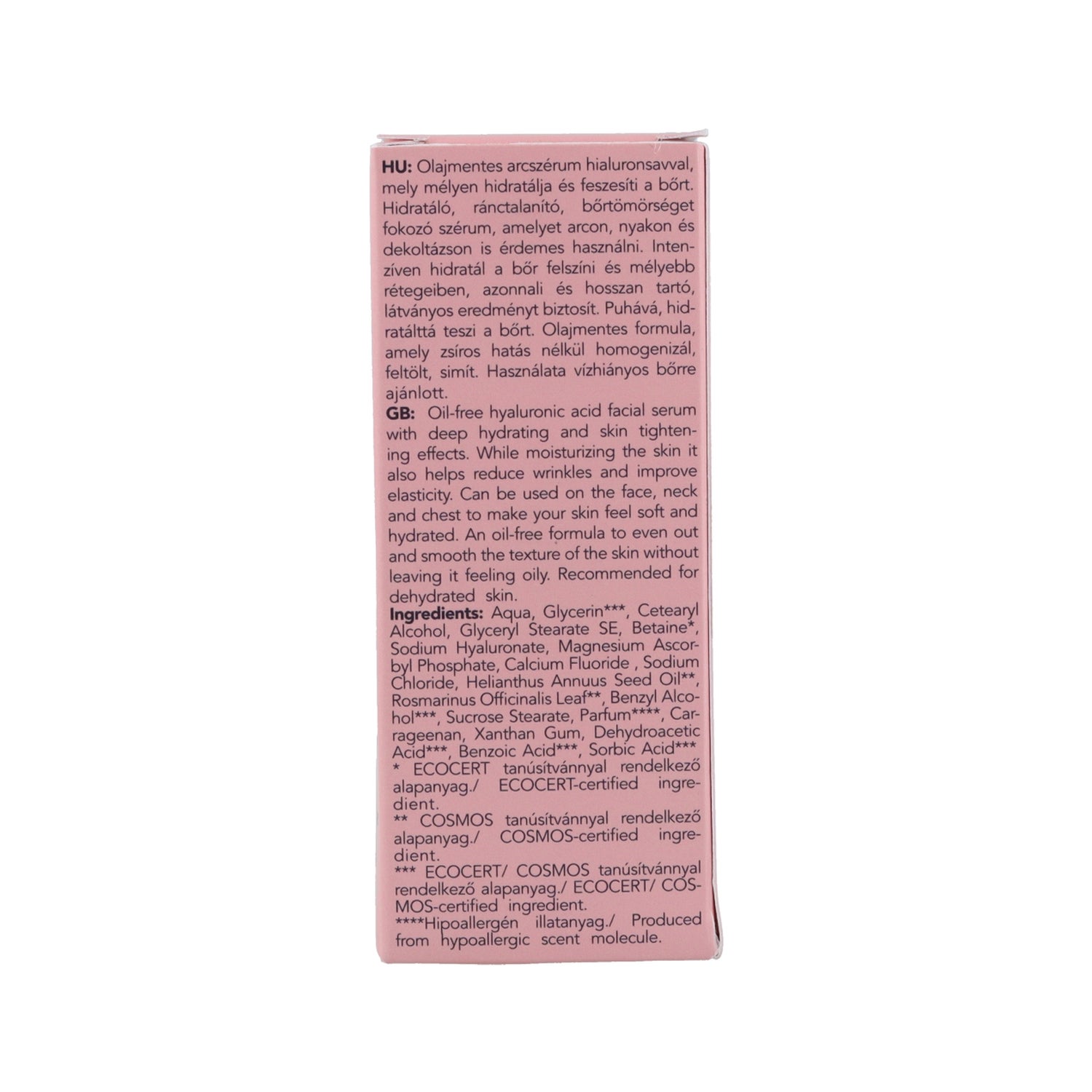 Naturlig fugtgivende serum med hyaluronsyre med anti-rynke effekt, hjælper med at stramme huden i ansigtet, på halsen og dekolletage, og giver blødhed og fugt.
