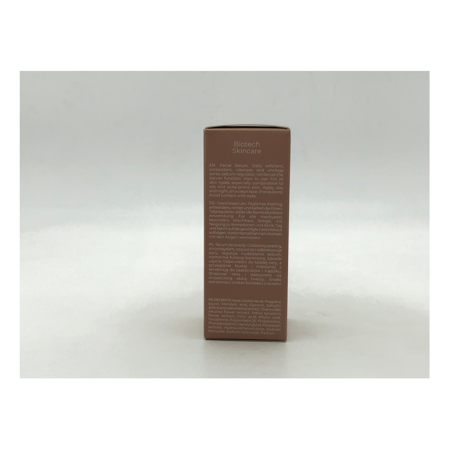 Serum til fornyelse af hudens overflade udviklet med 2% salicylsyre fremstillet af pilebark. Hjælper med at fjerne betændte porer med en eksfolierende virkning, der fjerner ophobede døde celler. Indeholder mandel-, citronsyre og fytinsyre, som hjælper med at regulere talgproduktionen i ansigtet og forebygger aknepletter. Beriget med havre-, kamille- og malveekstrakter, som giver blødgørende, antiseptiske, beroligende, blødgørende og antioxidante egenskaber. Velegnet til kombineret til fedtet hud. Velegnet til veganere.
