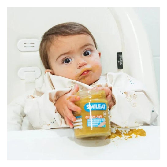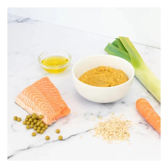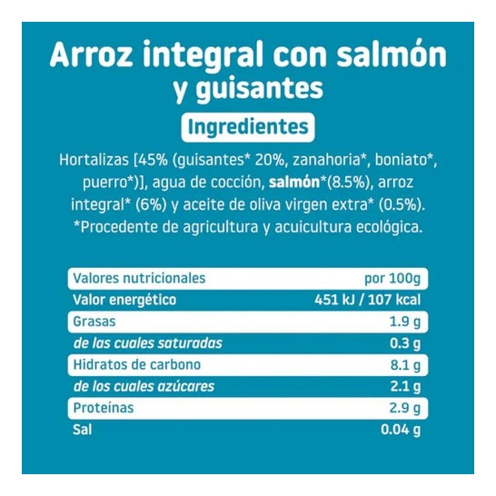 Krukke med økologiske fødevarer præsenteret i stykker. Velegnet til voksende babymad. Anbefales til ældre aldre for at hjælpe den psykomotoriske udvikling ved at introducere nye teksturer. Den består af en opskrift med en afbalanceret smag af fisk, laks og små stykker usprøjtet brune ris. Den indeholder også en række vegetabilske ingredienser såsom kartofler, porre, ærter, gulerødder, løg og ekstra jomfruolivenolie.