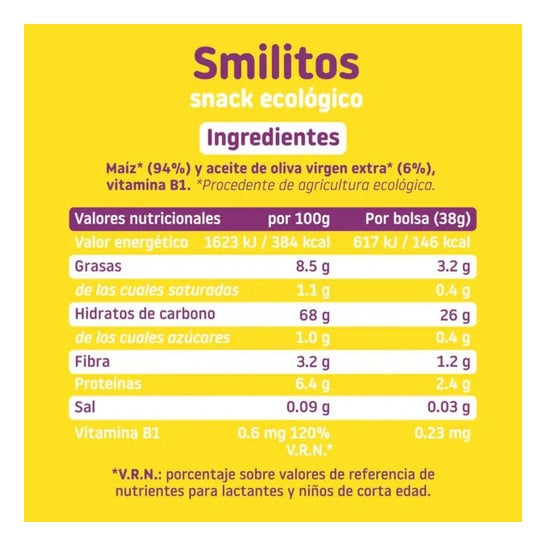 Smileat Smilitos - Gusanitos De Maiz Ecológico er en snack lavet med økologisk majsbagt og ekstra jomfru olivenolie 100% økologisk, som bliver koldt, når produktet er lavet.