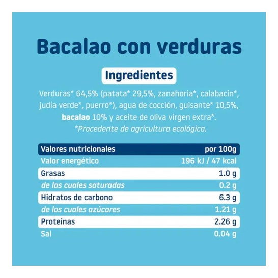 Smileat Tarrito Økologisk Torsk med Grøntsager 230g er en klar til at spise, komplet og afbalanceret børnemad. Denne opskrift er lavet med fisk og økologiske grøntsager. Desuden indeholder den ikke tilsætningsstoffer, konserveringsmidler eller tilsat sukker, og den er fri for gluten og æg.