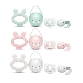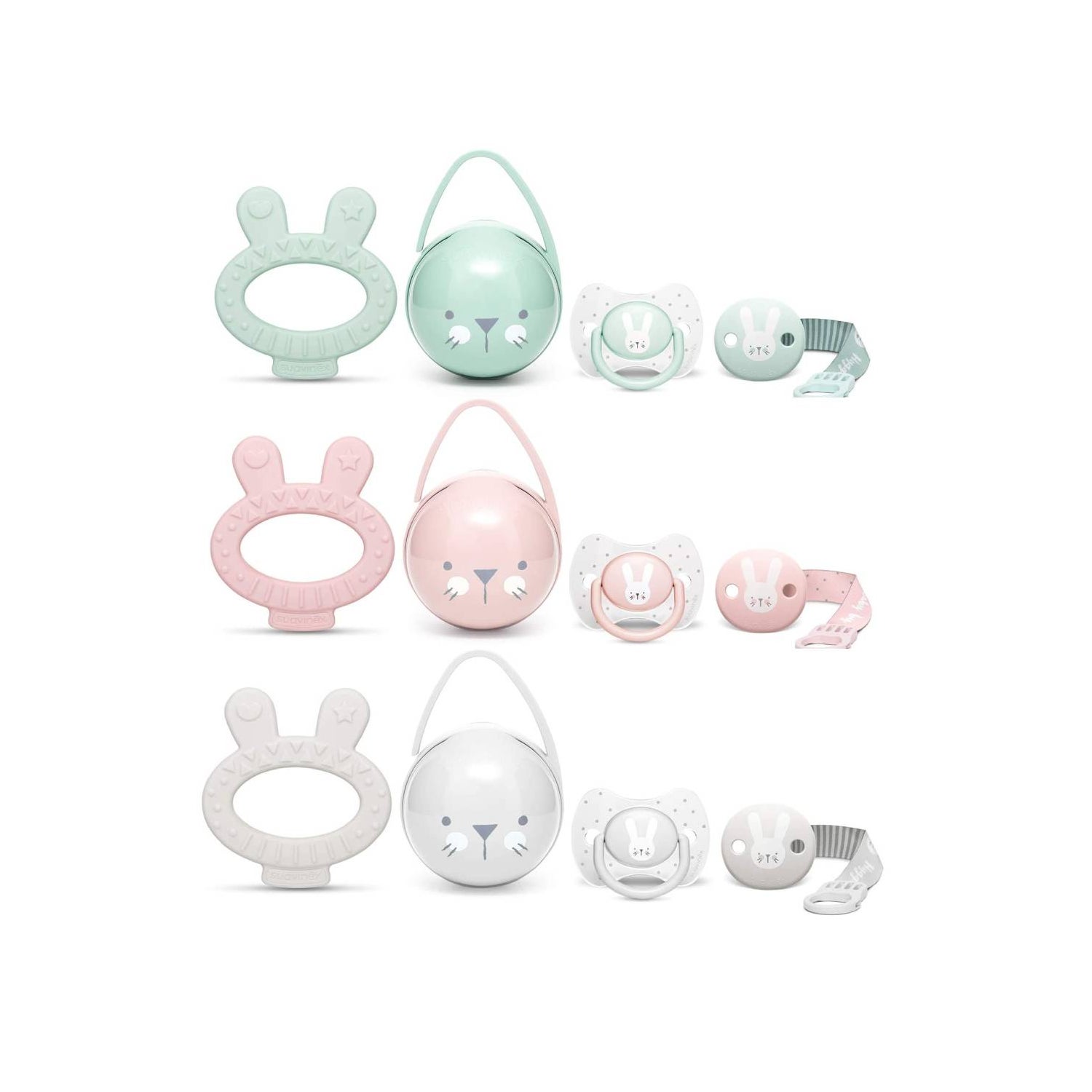 Suavinex babysæt med kanin-tegning, der indeholder en silikone-sut, en sutteklips med bånd, en sutteholder og en bidering. Sutten har en fysiologisk silikone-nipple, der er ideel til babyer op til 6 måneder, da basen er fladere og smalere, perfekt til babyens mund, da den udøver minimalt tryk på ganen. Sutteklipsen leveres med klemme og bånd for at holde den ren til enhver tid og forhindre tab. Sutteholderen har plads til to sutter. Silikone-bideringen er ideel til at trøste babyen under udviklingen af dens første tænder.