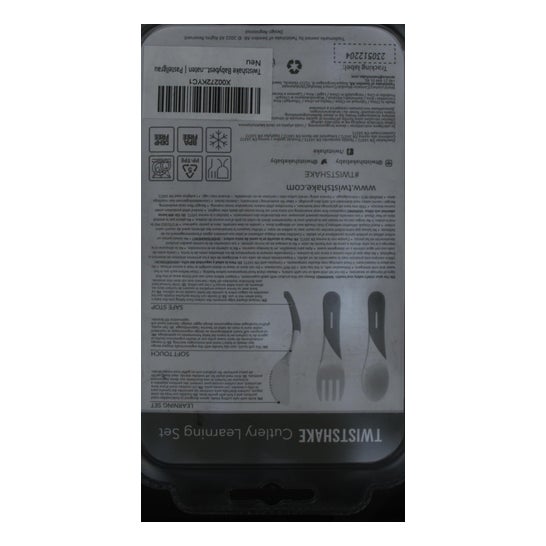 Læringsbestiksæt med ske, kniv og gaffel i grå farve til at hjælpe med udviklingsprocessen med at spise, indtil børn lærer at spise selv. De er lavet af et blødt, grebvenligt materiale, der forhindrer glatte hænder. Designet med et meget kort håndtag, så det passer i barnets hånd. Ideel til børn fra 6 måneders alderen.