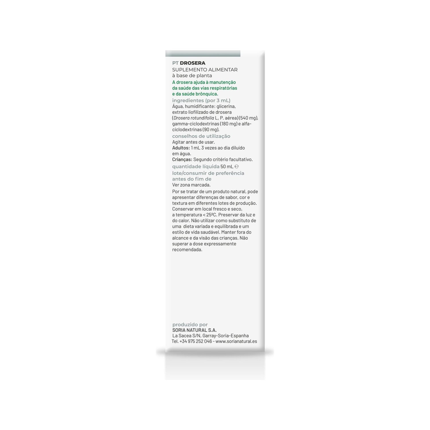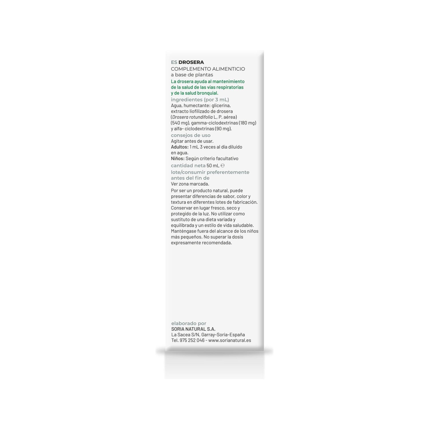 Soria Natural Drosera Extract 50ml har ekspiratoriske, antitussive og antispasmodiske egenskaber, der er ideelle til behandling og lindring af irriterende hoste af influenza- og katarreprocesser .