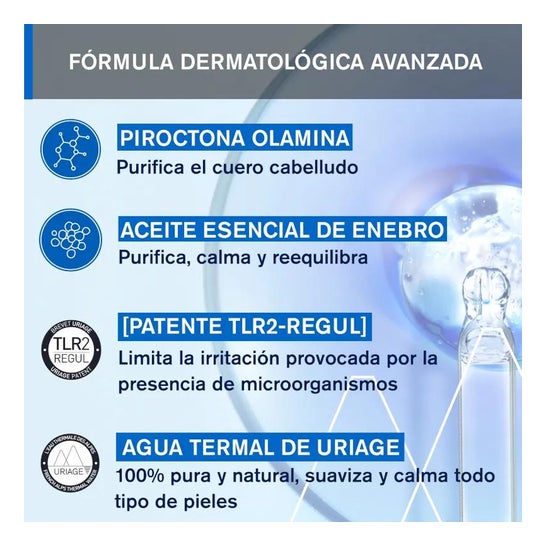 Uriage DS beroligende skalp spray indeholder æterisk olie fra Juniper, der virker som en aktiv anti- hovedbund. Det er også sammensat af anti-irriterende TLR2 Regul, det rensende Piroctona Olamina og Uriage termisk vand, der genererer en beroligende effekt.