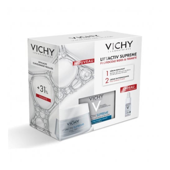 Vichy Liftactiv Supreme Set Anti-rynke og fasthedsprotokol er en pakke bestående af Vichy LiftActiv Supreme Anti-Wrinkle & Firming Care Normal to Combination Skin 50ml og H.A. Epidermic Filler Serum 10ml til anti-aging pleje af normal og kombineret hud. Indeholder hyaluronsyre for en fyldende effekt og bidrager til at korrigere aldringstegnene. Hjælper med at udfylde rynker, udviske fine linjer og tilføre volumen til ansigtet. Dens formel er hypoallergen, fri for parfume, silikoner og alkohol. Den er dermatologisk testet og egnet til følsom hud.