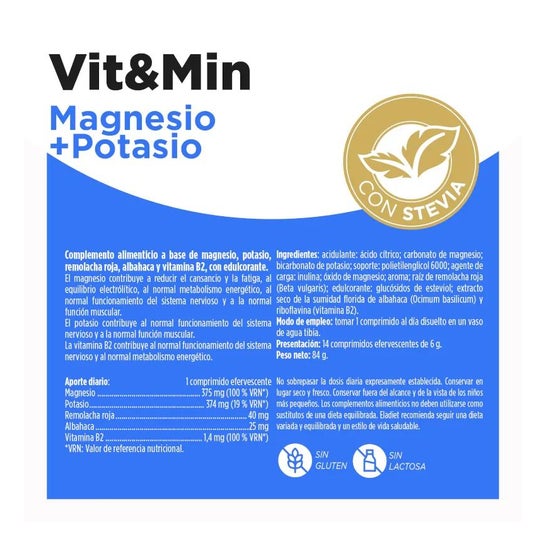 Vit&Min magnesium + kalium er et kosttilskud, der bidrager til at reducere træthed. Dets vigtigste ingredienser er magnesium og kalium; for det første fremmer magnesium den korrekte muskel funktion ved at reducere træthed.