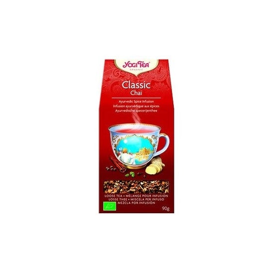 Yogi Te's Classic Chai, er en ayurvedisk infusion, der hovedsagelig er taget af den indiske tradition, da Yogi Bhajan serverede denne te til sine yoga-studerende. Det er trøstende, afslappende og krydret, med en essens af "komfort og overflod".