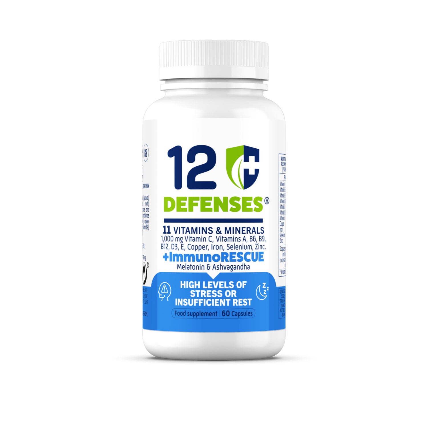12 Defenses +ImmunoRescue 60caps ist ein Multivitaminpräparat, das hilft, die Abwehrkräfte zu stärken, Stress zu reduzieren und den Schlaf zu verbessern