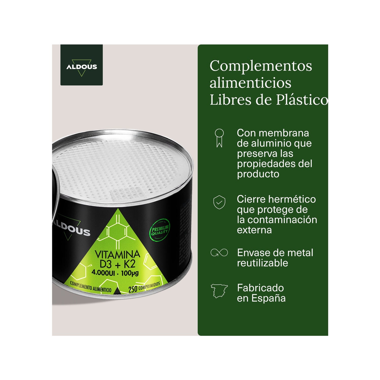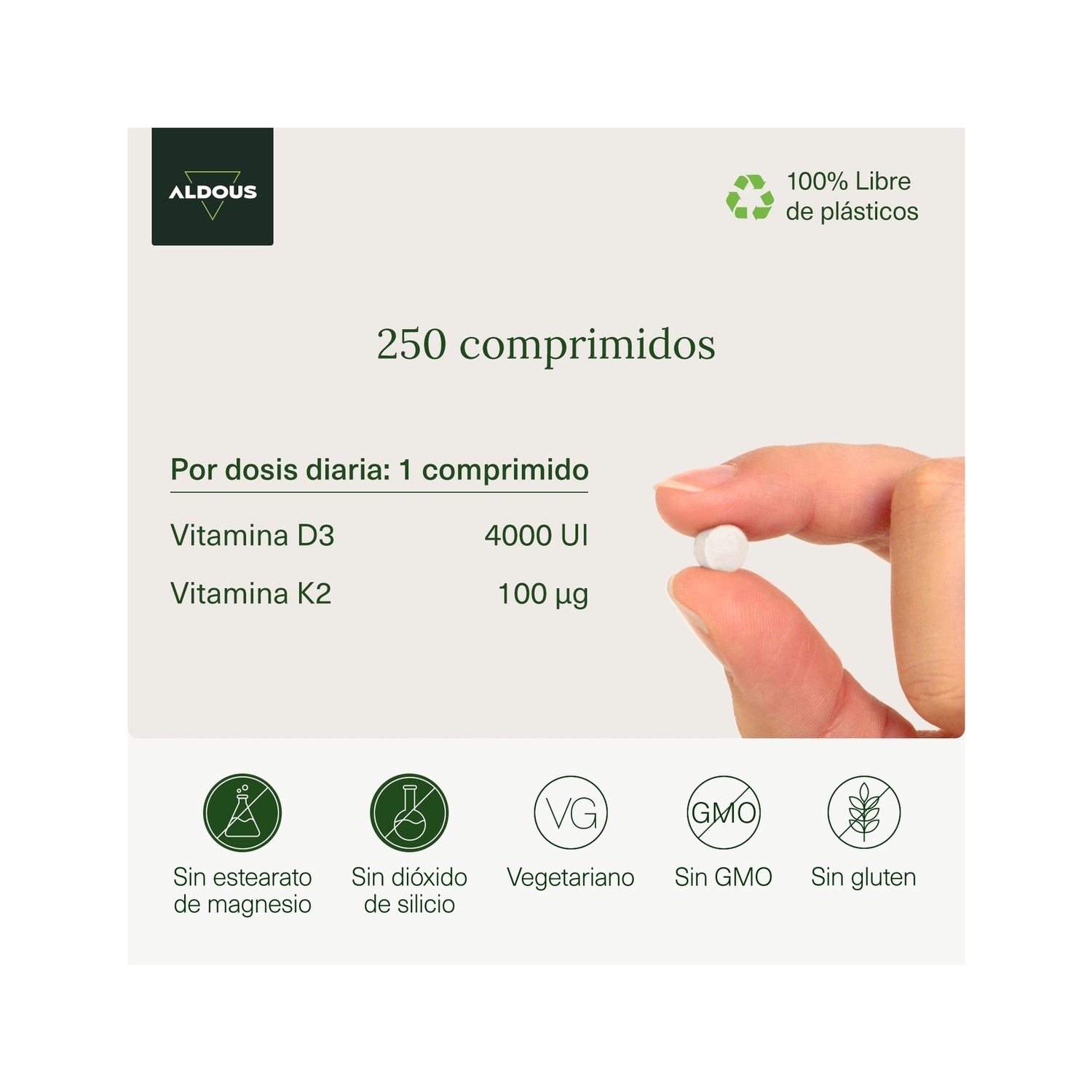 Stärken Sie Ihre Knochen und Ihre Gesundheit mit Aldous Vitamin D3 + K2. Präsentiert in 250 Tabletten für 250 Tage.