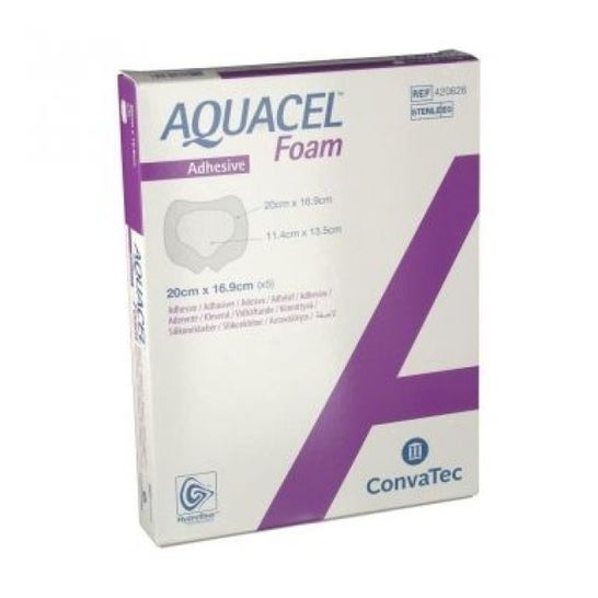 Haftverband hergestellt aus Schichten von Silikon, Schaum, wasserfestem Material und Aquacel. Box mit 5 Verbänden von 20x16,9 cm.