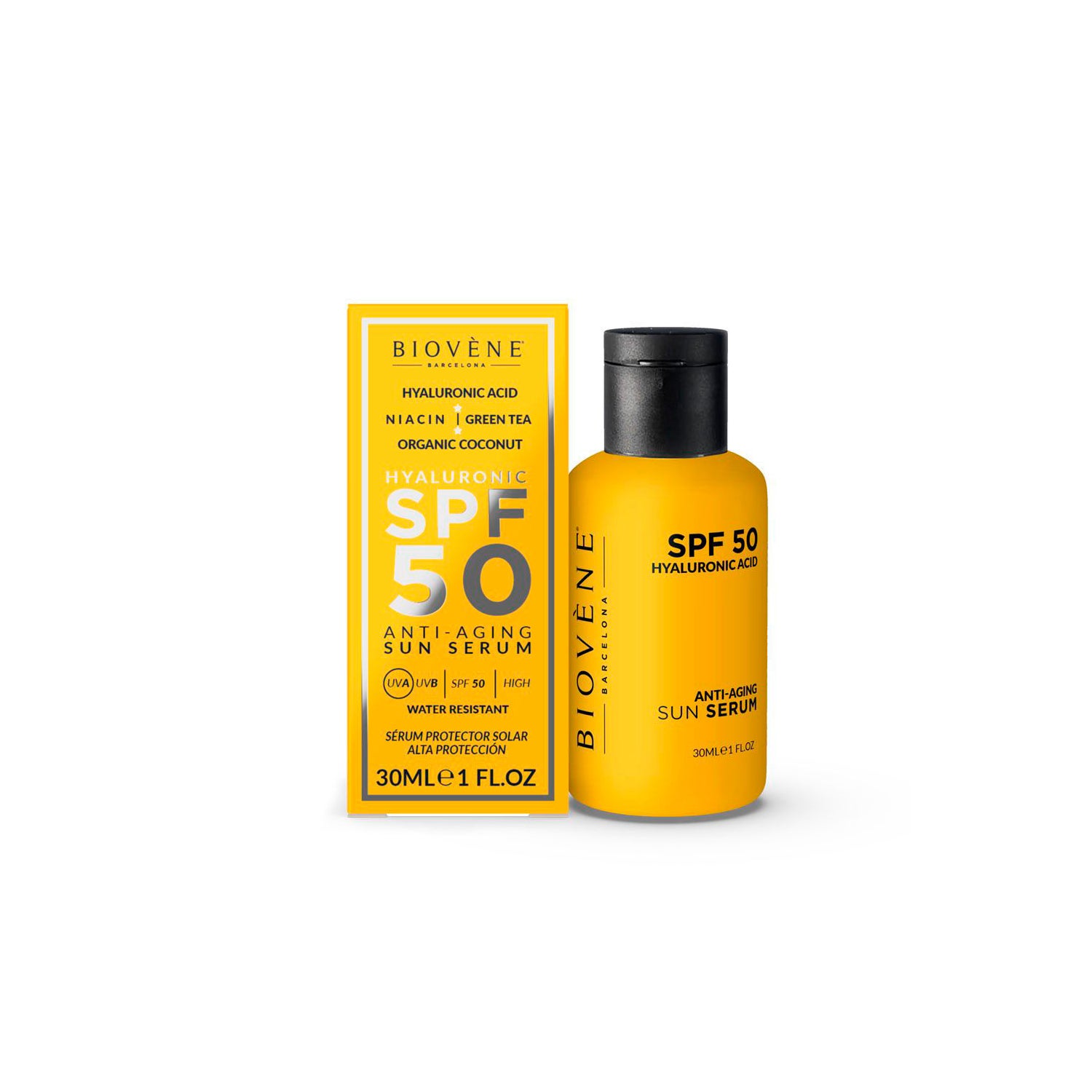 Biovène Hyaluronic SPF 50 Anti-Aging Sun Serum 30ml ist der perfekte Verbündete, um die Haut des Gesichts und den Augenbereich vor der Sonne zu schützen und zu pflegen. Dieses leichte und nicht fettende Serum bietet einen hohen Schutz mit SPF 50 und enthält Hyaluronsäure und Niacinamid, die intensiv hydratisieren und photoaging vorbeugen, ideal, um die Jugendlichkeit und Strahlkraft der Haut zu erhalten.
